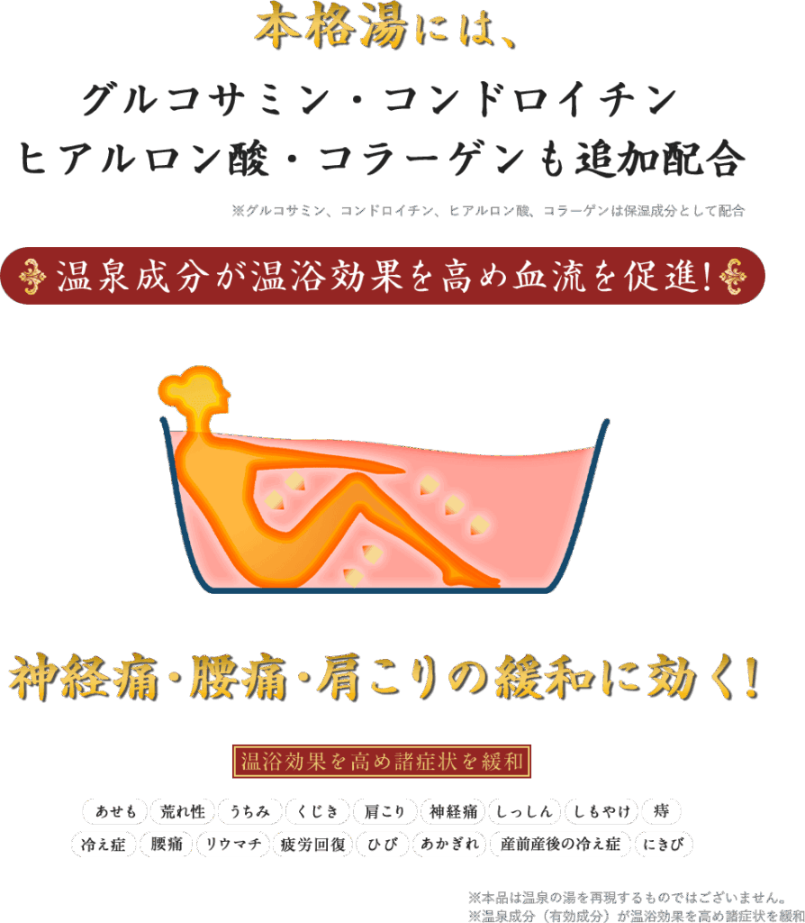 ※温泉成分(有効成分)が温浴効果を高め諸症状を緩和